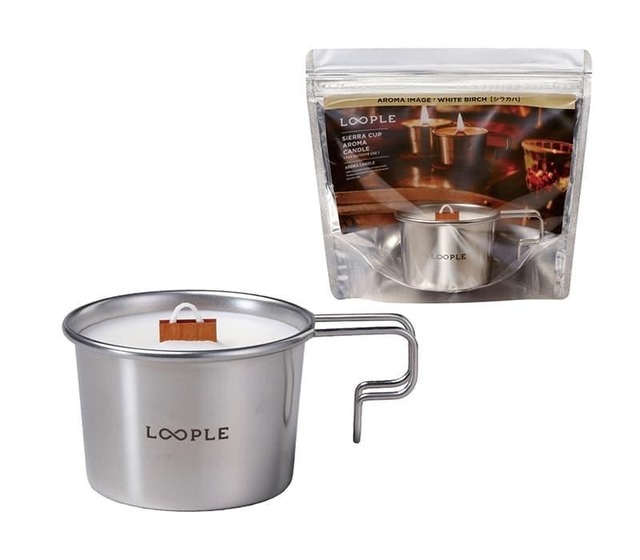 揺らぐ炎と焚き火の音に森の香り。 シェラカップで灯す、極上のアウトドアアロマ。 「シェラカップアロマキャンドル」は、炎・香り・音でキャンプの夜を豊かにするアウトドアキャンドルです。 木芯ならではの“パチパチ”とした焚き火のような音と、揺らぐ炎が心をやさしくほぐします。 香りは「シラカバ」と「シトロネラ」の2種類。 ナチュラルラベンダーやウッディな精油をブレンドしたスモーキーな「シラカバ」、 虫よけ効果が期待できる精油100%の「シトロネラ」。 どちらも自然と調和する香りで、アウトドア空間に心地よく溶け込みます。 コンパクトながら約15時間燃焼し、交換用のリフィルキャンドルで繰り返し使える仕様。 使い終えた後はシェラカップとして再利用できるため、ギアとしても長く活躍します。 焚き火を囲むように、炎と香りに癒やされる。 LOOPLEが届ける、自然とつながる極上のキャンプ時間をお楽しみください。 【シラカバ】 ラベンダー、ローズマリー、ジュニパーベリーなどの天然精油が配合された、ウッディなやさしいシラカバの香り 【シトロネラ】 自然な虫よけ効果と爽やかなレモンの香りを備えた、天然精油100%のシトロネラの香り。 木芯タイプ:焚き火のようなパチパチ音をたてて燃焼 燃焼時間:約15時間 素材:ステンレス 重量:約200g 容量:約160ml シェラカップサイズ:横幅7.9cm × 奥行き11㎝ × 高さ5.3cm パッケージサイズ:横幅21cm × 奥行き9㎝ × 高さ19cm 特徴:シェラカップを再利用できるサステナブルなキャンドル