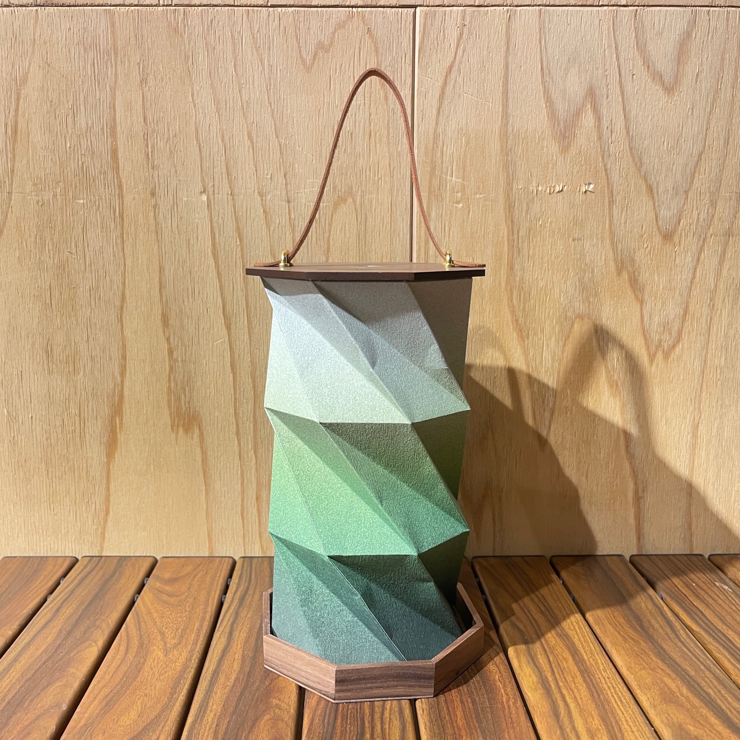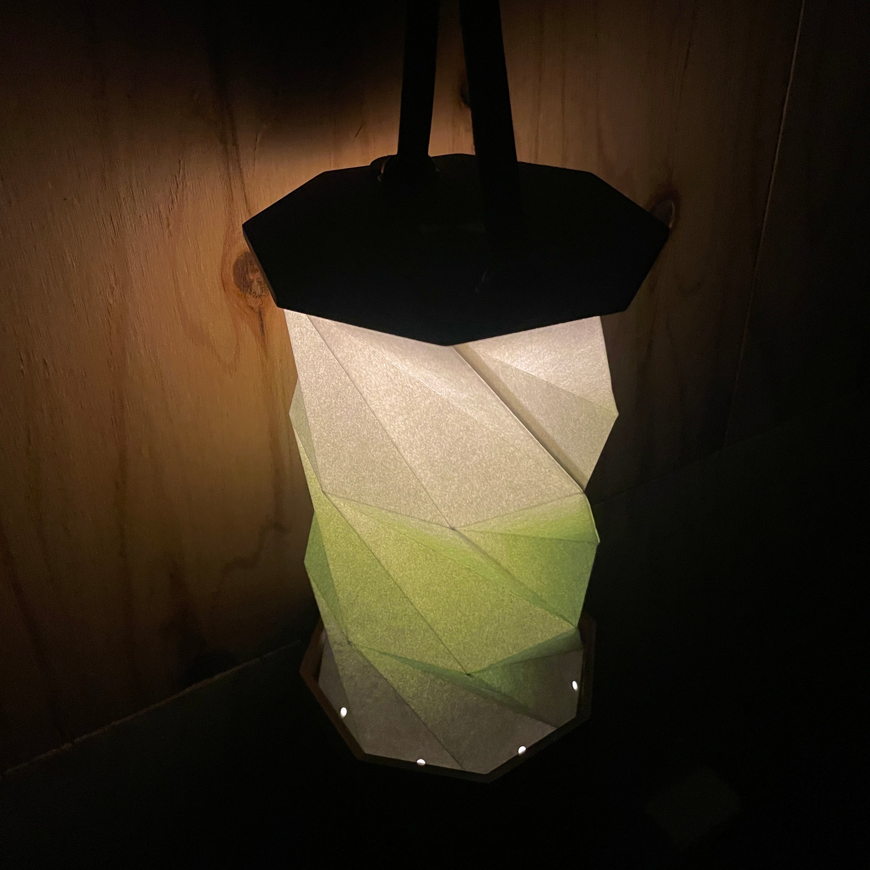 シェードの折り目が3段になっており、高さを3段階に調整でき、折り方次第で緑部分を強調することや、緑部分を折りたたみ和紙のような風合い強調し、より灯篭らしい雰囲気を楽しむこともできます。