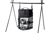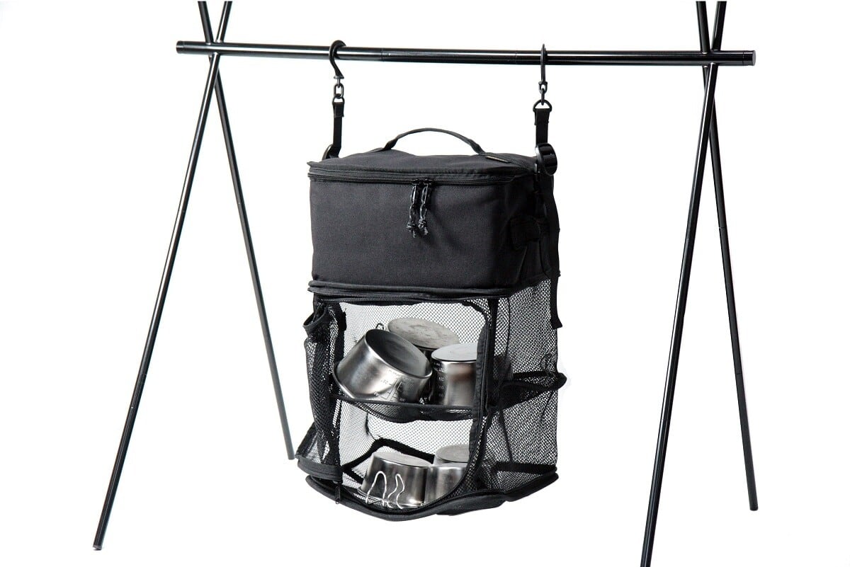 クッカー・コッヘル・鍋・フライパンなどを収納して持って行くコンテナの下にファスナーでドロップダウン式のドライネットを搭載した画期的で機能的なコンテナ+ドライ。 取り外し可能なフックを取り付ければ、インディアンハンガー、ワンポールテントなどのポールにランタンハンガーなどで吊下げることが出来る。