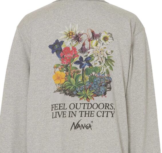 高山植物をヴィンテージ調に描いたオリジナルグラフィックをバックにプリントし、“アウトドアを都市で楽しむ” という今季のテーマを表現したスウェットシャツ。一枚でも存在感のある仕上がりになっています。