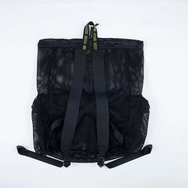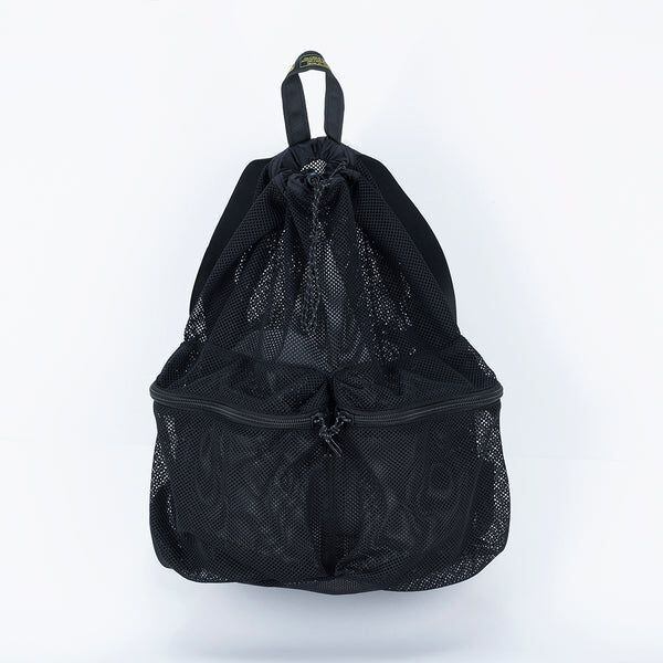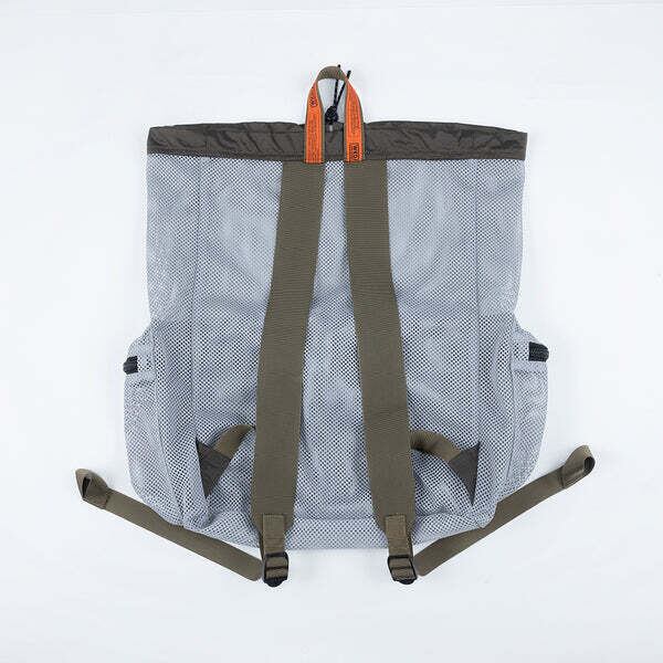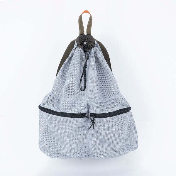新型の巾着式バックパック。キャンプなど外遊びに活躍する大きめのサイズ感。両手が自由になるバックパックはやはり便利。
