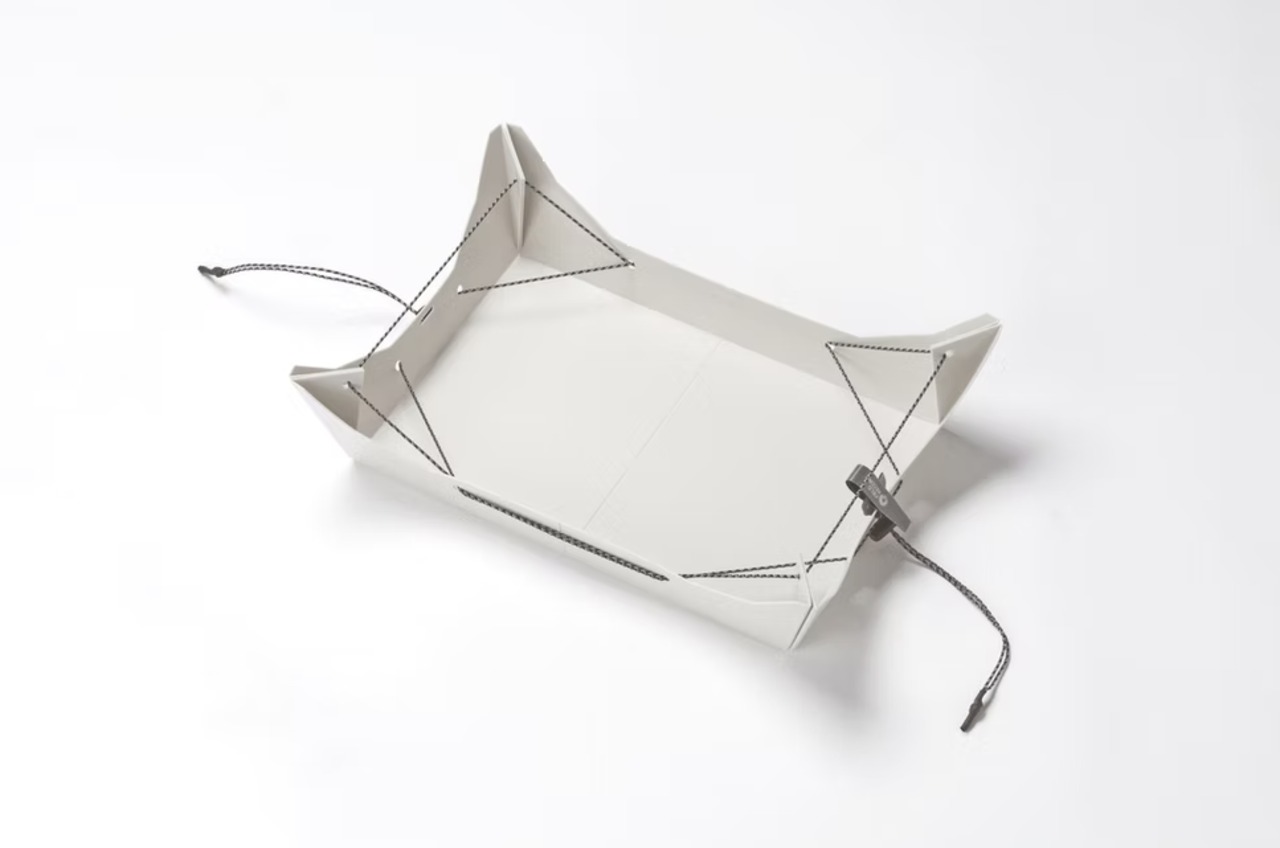 一枚のポリプロピレン板を、太さ1.5mmのオリジナルダイニーマ芯ガイラインで締めることにより重さ45gの超軽量のテーブルになります。