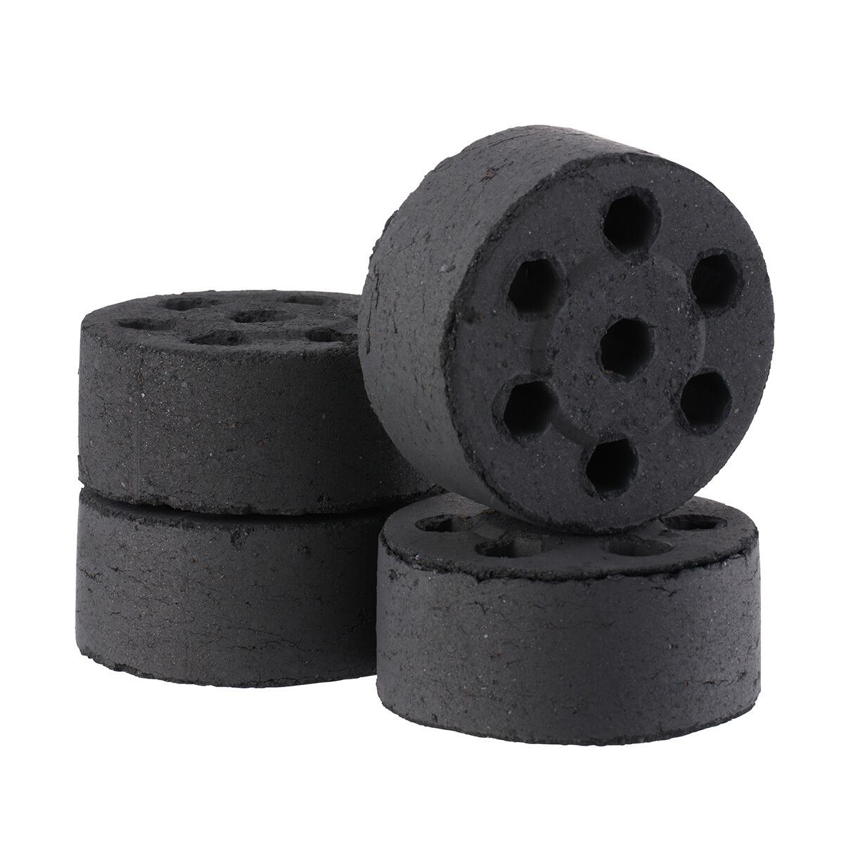 平たく成型したココナッツチャコールに通風孔を開け、さらに片側を凸面にしたことで、平面に置いても炭の下に空気の通り道を確保し、燃焼効率を高めています。