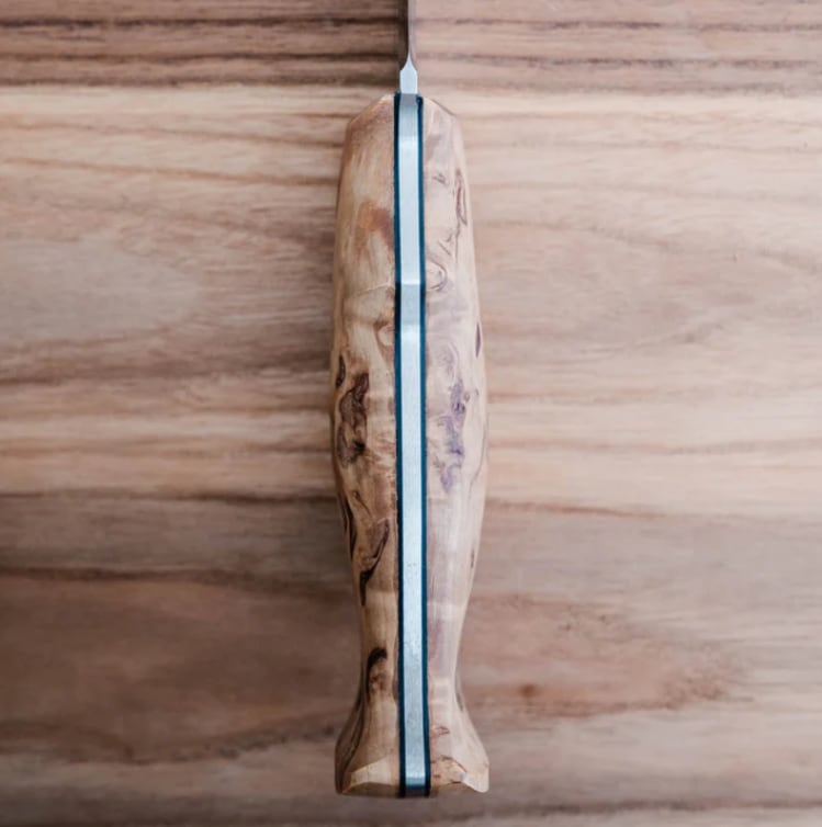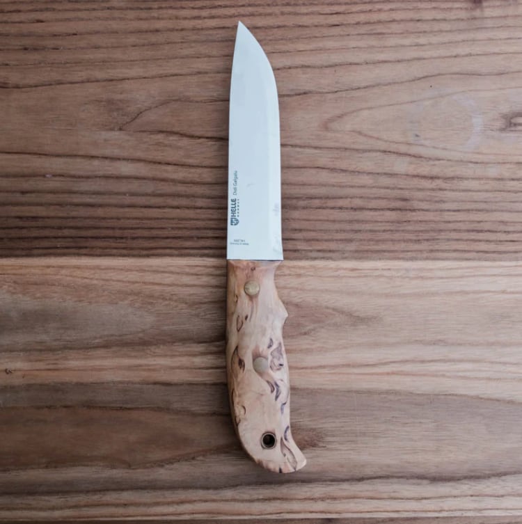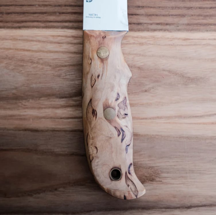 ハンドルには、ひとつひとつ木目の模様が異なる美しいカーリーバーチ(白樺)を使用。カーリーバーチは白樺の遺伝的多様性が生み出す独特の模様で知られており、この模様がナイフに独特の表情を与え、一つとして同じものがないのが特徴です。ヘレナイフで使用する木材は最低でも1年間、低温倉庫で保管し、ゆっくりと乾燥させます。その後様々な工程を経て、手作業でハンドルの形を整え仕上げをしています。全てのナイフは異なる手法と工程で作られていますが、始まりは同じで、中には、木材から完成品まで50もの工程があるナイフもあります。