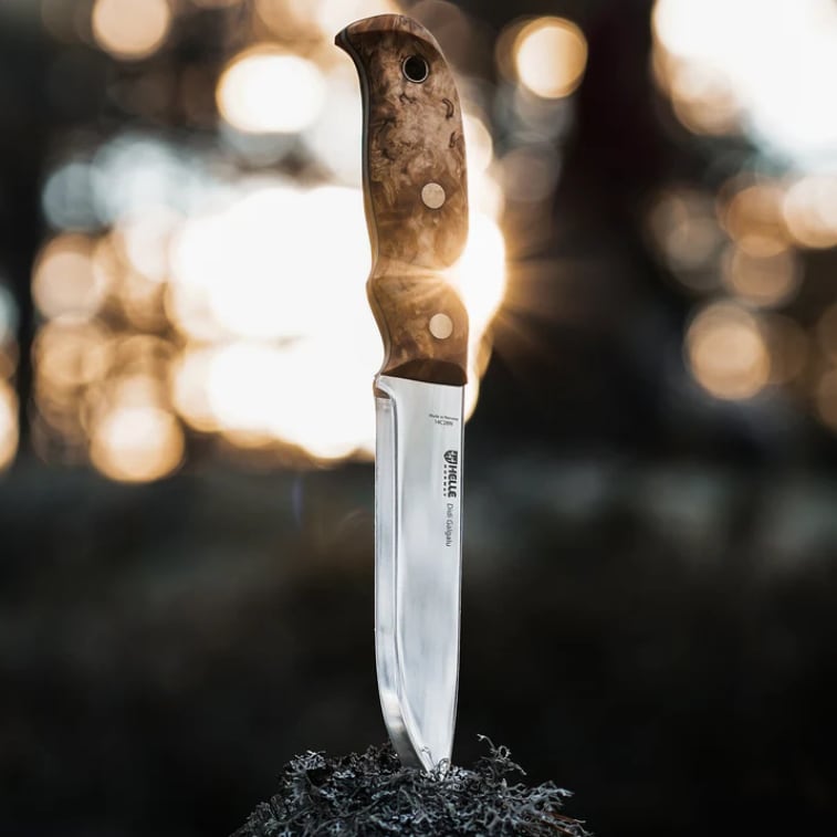 ブレードはフルタング(鋼材がハンドルの末端まである構造)になっており、鋼材は錆びにくく摩耗性に優れたステンレスを高度に研磨されたALLEIMA14C28Nスチールを使用。刃の厚みが3ミリあるので、バトニング(薪割り)などのヘビーな作業にも十分な強度と耐久性を備えています。※バトニングに関して、十分な強度は備わっておりますが使用方法や状況によってナイフの破損に繋がる為、自己責任でお願いいたします。バトニングによるナイフの破損は補償の対象外となります。